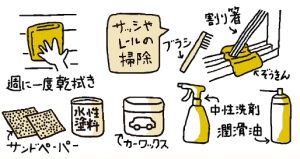 サッシやレールが汚れている時は、小さめのブラシを使ってお掃除。