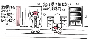 どうしても窓を開けて換気をしたい場合は、開けるスペースを10cm程度に抑え、レースカーテンを引いた状態で行ってください。